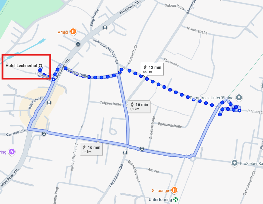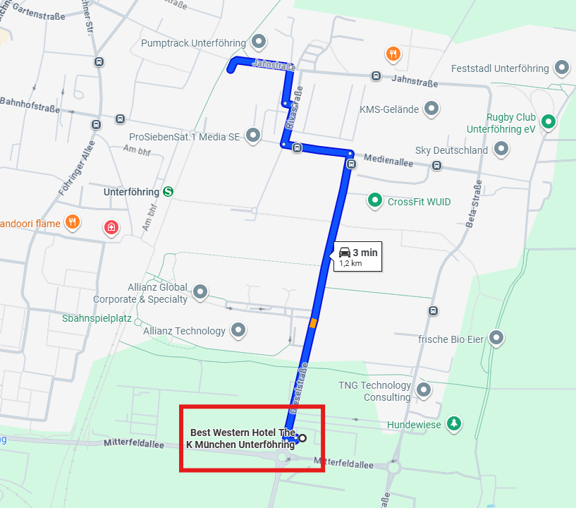 Fahr mit der S8 bis Unterföhring. Vom Bahnhof sind es ca. 8–10 Minuten zu Fuß zu unserem Büro. Orientier dich ab dem Bahnhof Richtung Ortsmitte und folge den Fußgängerweg bis zur Jahnstraße.